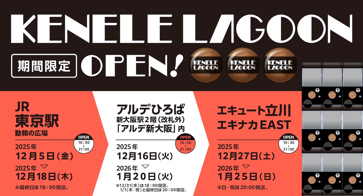 12月はJR東京駅動輪の広場、アルデ新大阪内アルデひろば、エキュート立川エキナカEASTに出店することをお知らせいたします。