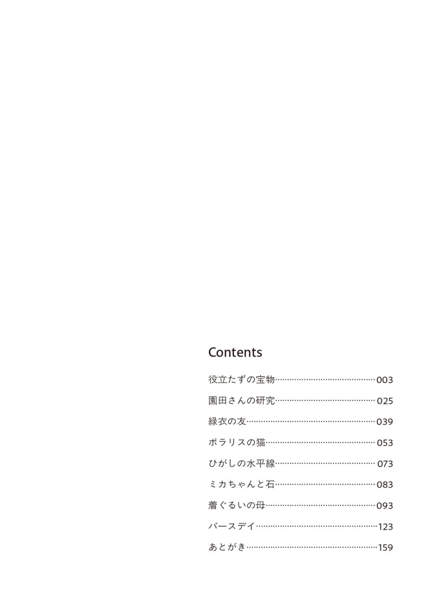 可愛い物好きじゃだめですか?『役立たずの宝物』、自分の最期を飾るための研究を続ける老人『園田さんの研究』、身分違いの恋に思い悩む謎の男『緑衣の友』、猫に化けた亡き妻『ポラリスの猫』、水没した東京に残されたカップル『ひがしの水平線』、擬人化薬でインスタ映え!?『ミカちゃんと石』、エスカレートしていく母の欲望『着ぐるいの母』、死体蘇生で再会する家族『バースデイ』。コメディからシリアスまで、多彩な表現で読者を惹きつける堤葎子、珠玉の作品集!